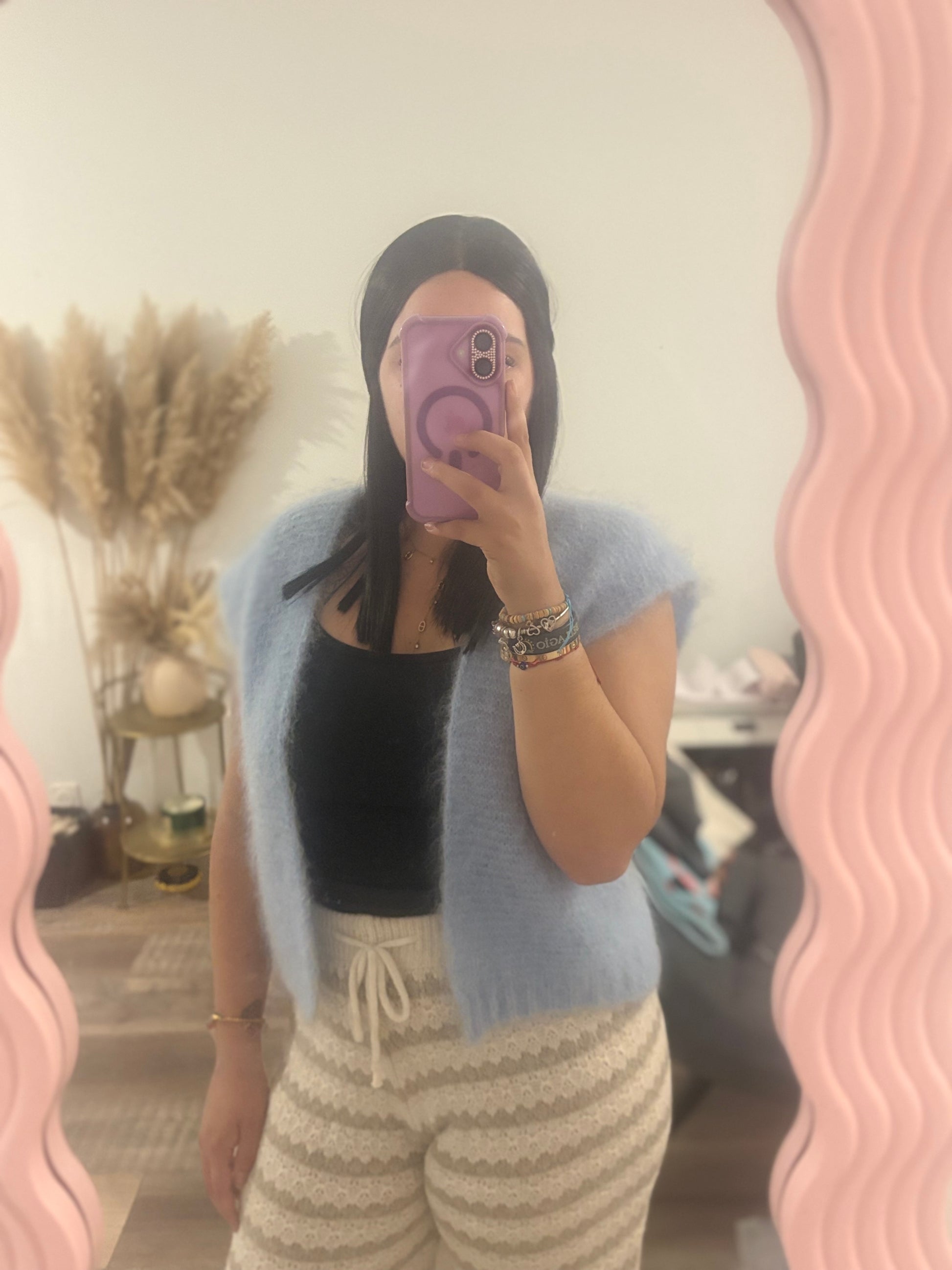 Douceur et élégance réunies avec ce pull sans manches bleu clair, parfait pour un look frais et tendance. Facile à porter seul ou par-dessus quelque choses , il apporte une touche moderne et chic à toutes vos tenues.