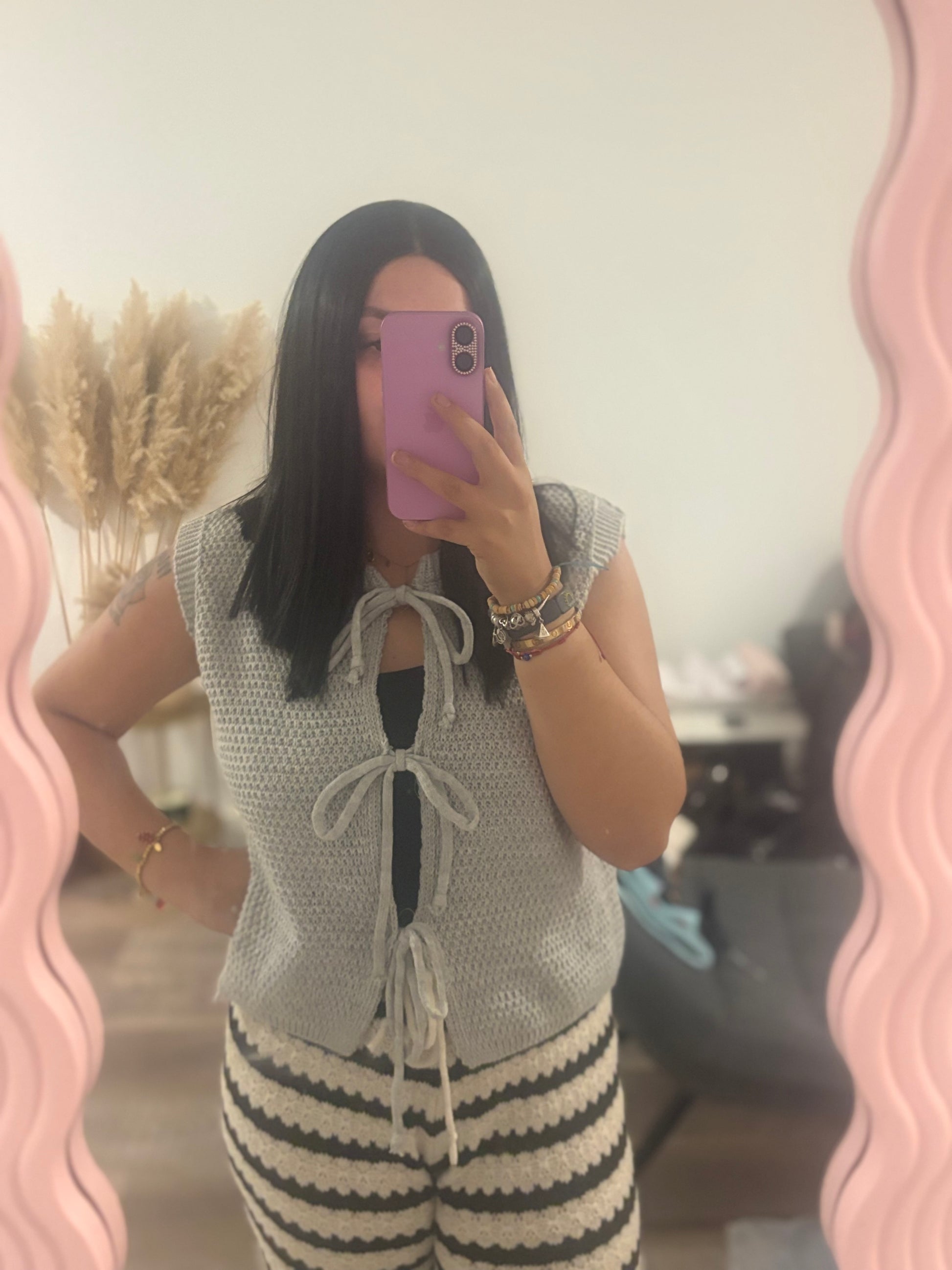 ✨ Gilet gris à nœud – 100% acrylique ✨